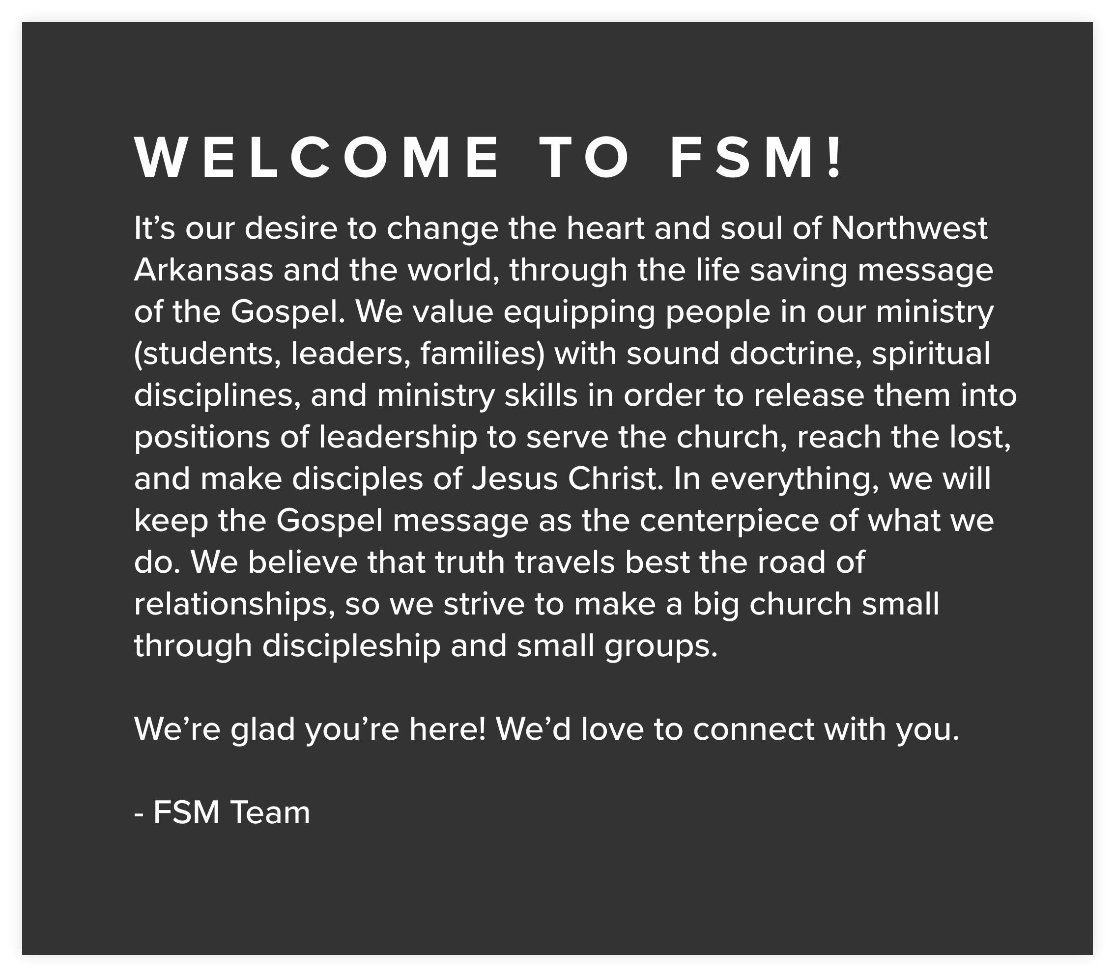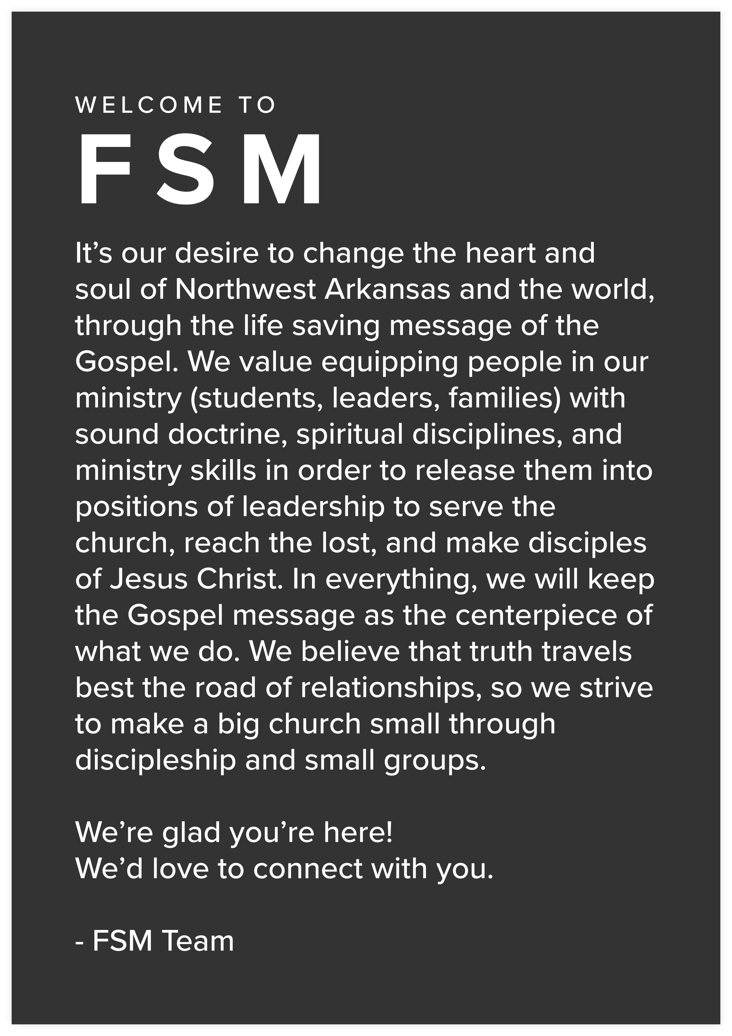 Yes. We’ve created an app where you can find all registration forms and calendars as well as our curriculum for Cell Groups, Sermon Audio for Sunday mornings, and Bible reading plans. It’s a great way to stay connected with FSM on the go! Download our app for Apple and Android devices by searching FSM NWA.